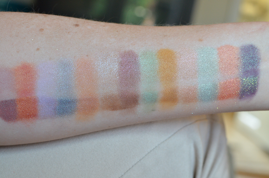 Several of these shadows applied pretty well even over bare skin, especially Hellenic Fire, Paramour, Plum Pudding, Colonel Mustard, and Mystic Ocean. Most all of them applied really well over the UD Primer Potion, though UDPP isn’t my favorite primer, so I feel like they would have applied even better over my usual NARS smudge-proof eye primer. They all shone their best over Pixie Epoxy, which caught the shift and glitter of each one beautifully.