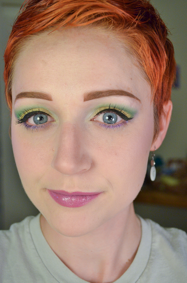 I bemoan not having natural light for photos!! But I enjoyed doing a much more out-there look with these shadows as a demonstration of their pigmentation and blendability (shut up, SpellCheck, I’ve decided that is a word) I built up the Not So Loud Lilac blush a bit to get a better look at the color, and I still hold my original opinion from the swatch– it is a lovely shade, and I am excited to see how far I can take it this summer.