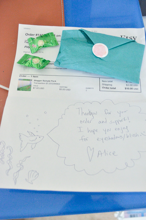 My package arrived with a neatly folded tissue paper pocket of my items, as well as a couple of cute little candies (curse you, keto!!), and a very sweet note from Alice. These notes are sometimes my favorite part of ordering indie– I feel all blushy and fan-girly (they talked to ME!!).