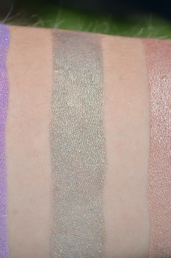 Mmmmm, gray taupes… I’m excited to use this as an all-over lid color! This is a brown-gray color, more cool leaning. I’ve seen this described elsewhere as having gold shimmer, and I believe it does, but I also see a bit more green/khaki from this shadow, especially apparent in the sunlight.