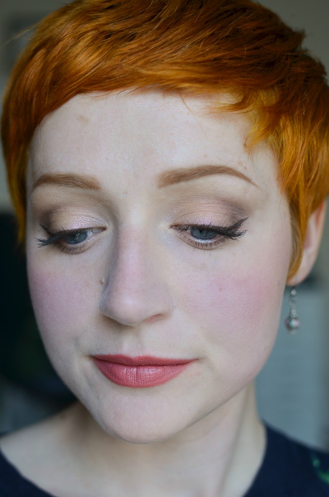 It should also be noted that I received and also used in this look Darling Girl’s Don’t Eat The Apple Inner Glow blush, which is a bright red blush with slight blue shift. I’ll do swatches when I have a little more time (hooray for going into work on your weekend days), but because I love my NARS Exhibit A but really have been enjoying loose powders, I knew I needed to give it a try. It is STUNNING. It gives a very natural pink flush when applied lightly, and I have no doubt that it could be built up to obscene vibrancy. For my purposes, however, it provides the natural looking blush I’ve been looking for, applies very smoothly, and blends out well.