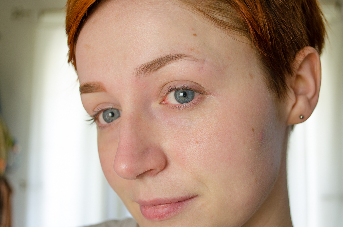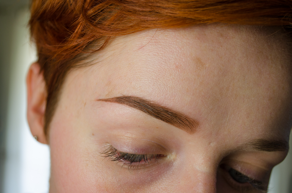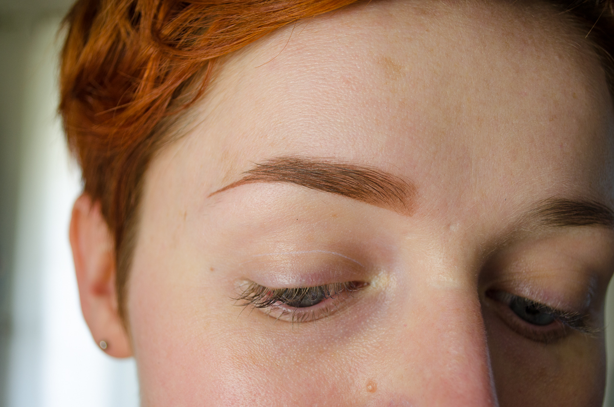 The bottom brow line drawn, go back in without getting more product on your brush (I’M SERIOUS) and fill in the bulk of that portion of the brow, ignoring the inner most portion for the time being. You can see in this picture that I’ve filled in just the middle chunk, leaving the inner and outer for later. Use your brush to blend the bottom line up into your brow hairs. Dipbrow has been pretty waterproof for me, but only once it dries. Work to blend it out fairly quickly to blend smoothly, before it dries.