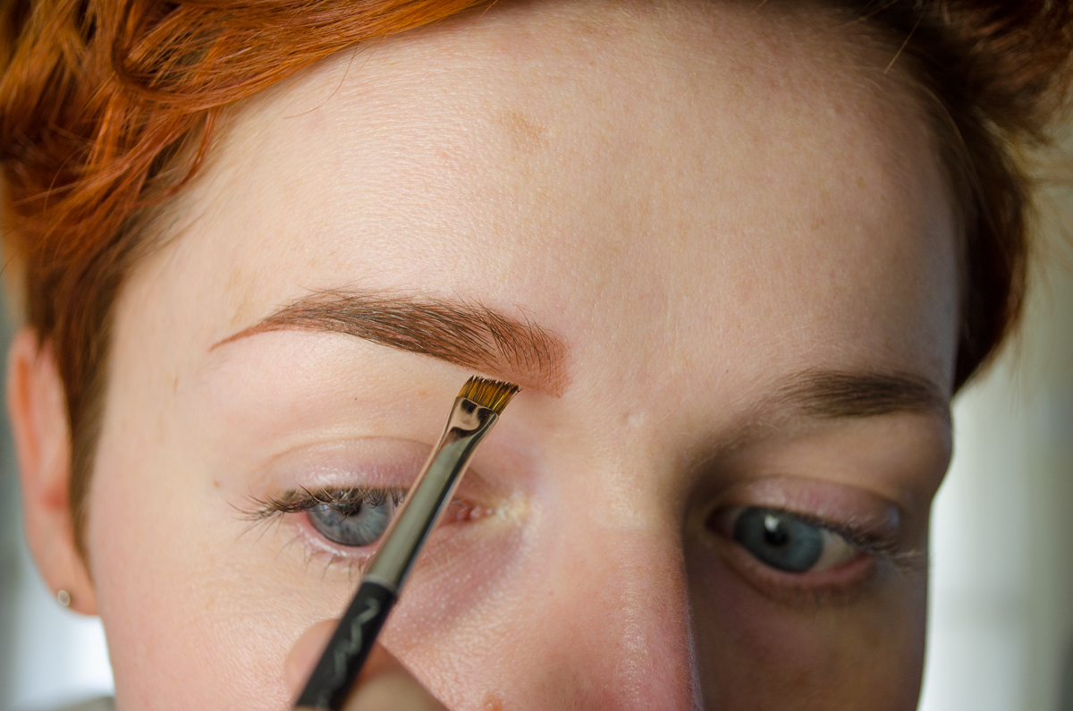 Pick up new pomade on your brush. Locate the upper arch of your brow, and draw a line from it to the outer edge of the tail. Fill in with the pomade, allowing the outer edge to be darker. Using short, rapid strokes helps me to make sure it’s all blended.