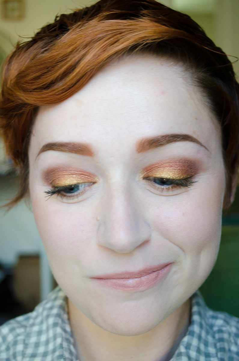 Also not entirely clearly depicted here is taking your darker copper shadow and blowing it out in the crease just a little more, into that matte neutral color you applied to the brow bone earlier.