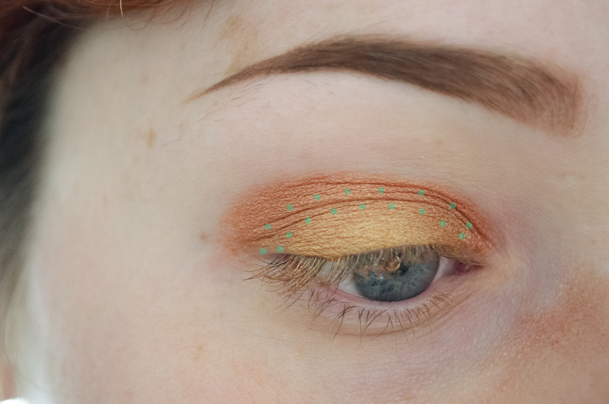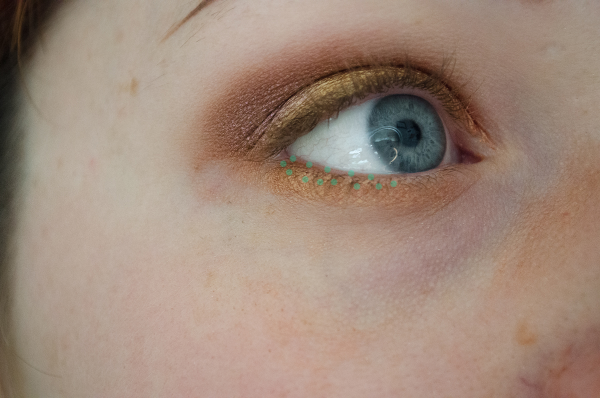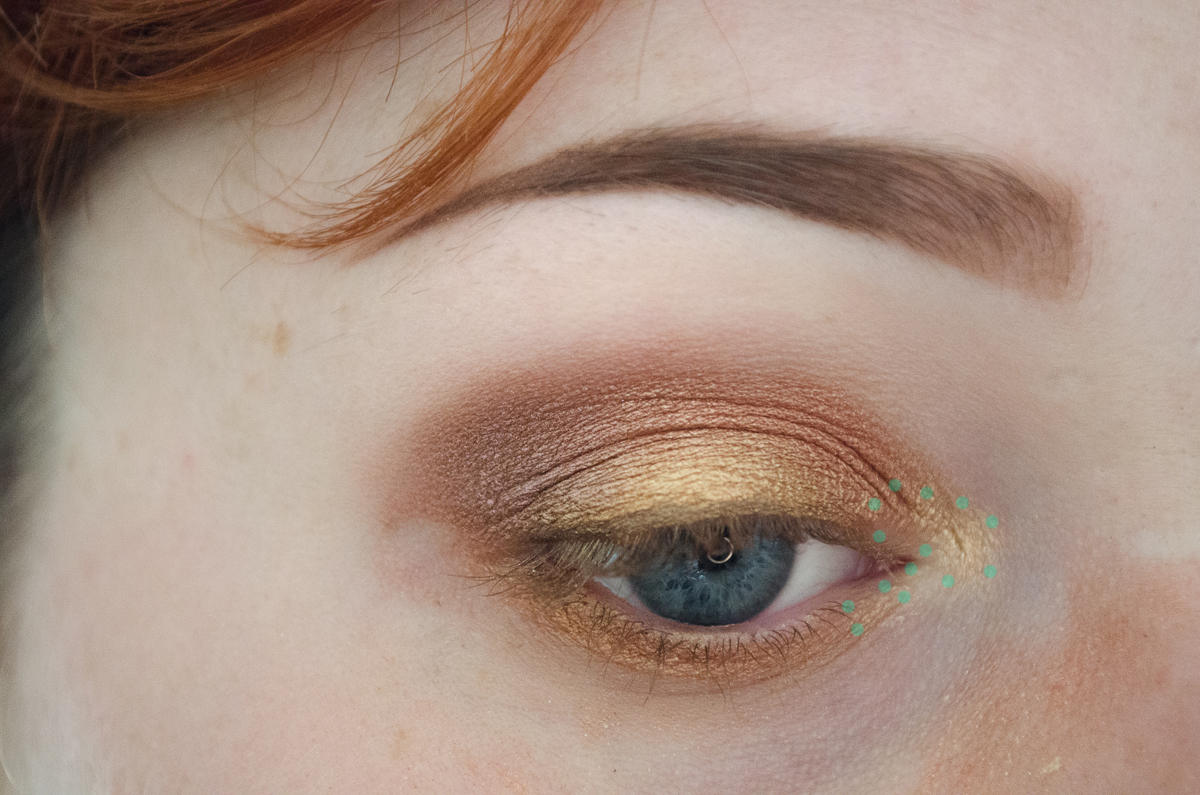 Take some of that copper and gold and apply to the lower lid. I applied the gold first across most of the lower lid, and then the copper to the outer half.