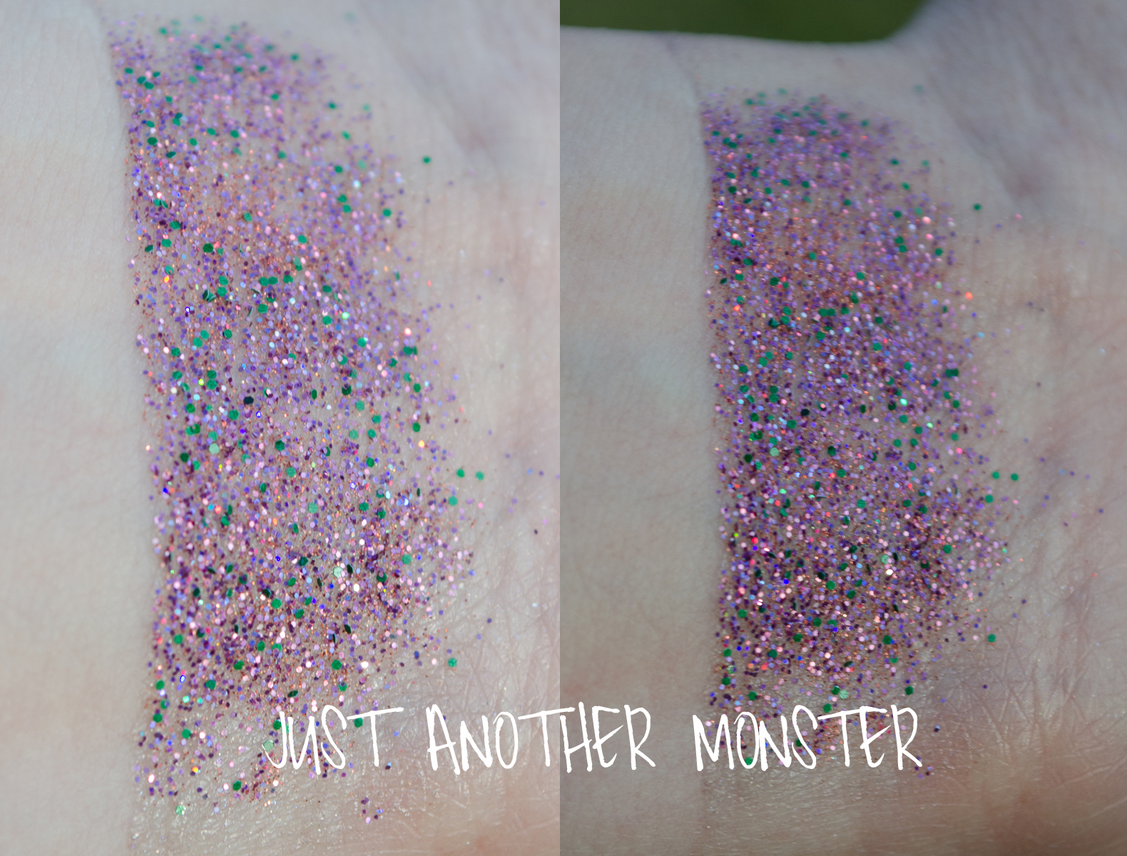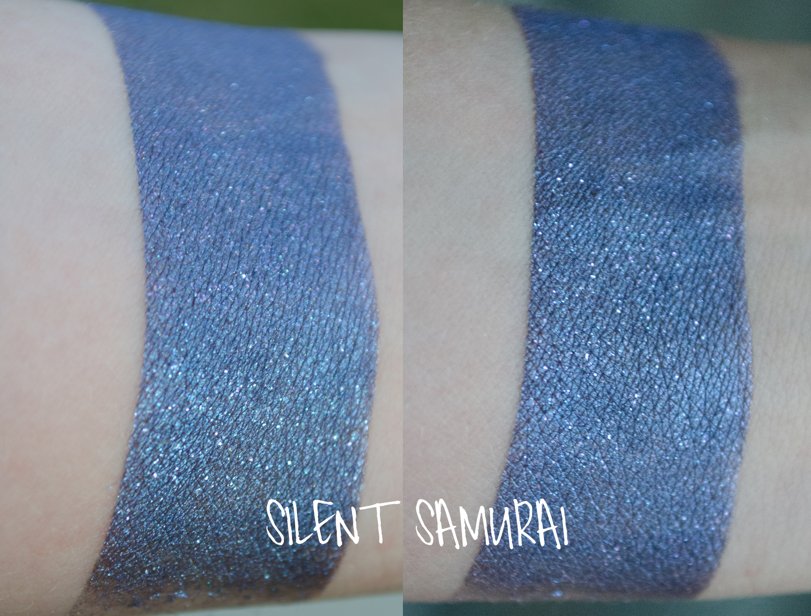 Silent Samurai has a blue base with tons of pink (and maybe some blue?) sparks. I’m not usually a huge blue fan, but holy cow this is so gorgeous! Admittedly, it looked a lot more purple in the jar than it did on my arm, which I was surprised to find. I think it’s because of how prominent the pink sparks show up over the blue base in the jar. I applied it over Darling Girl Glitter Glue, but I think it might need a stronger adhesive like Pixie Epoxy to really pull out the pinks? In any case, this is a really pretty color.