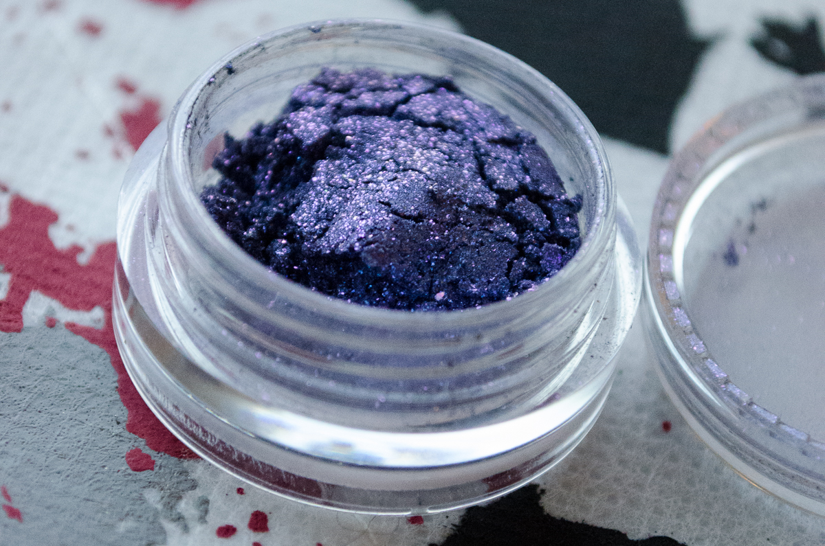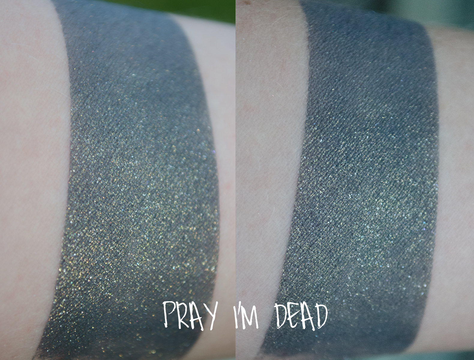 Pray I’m Dead is a charcoal colored shadow with gold/green shine. It looks pretty consistent between the swatch and the jar, as you can see. I think this would make one hell of a unique smoky eye!