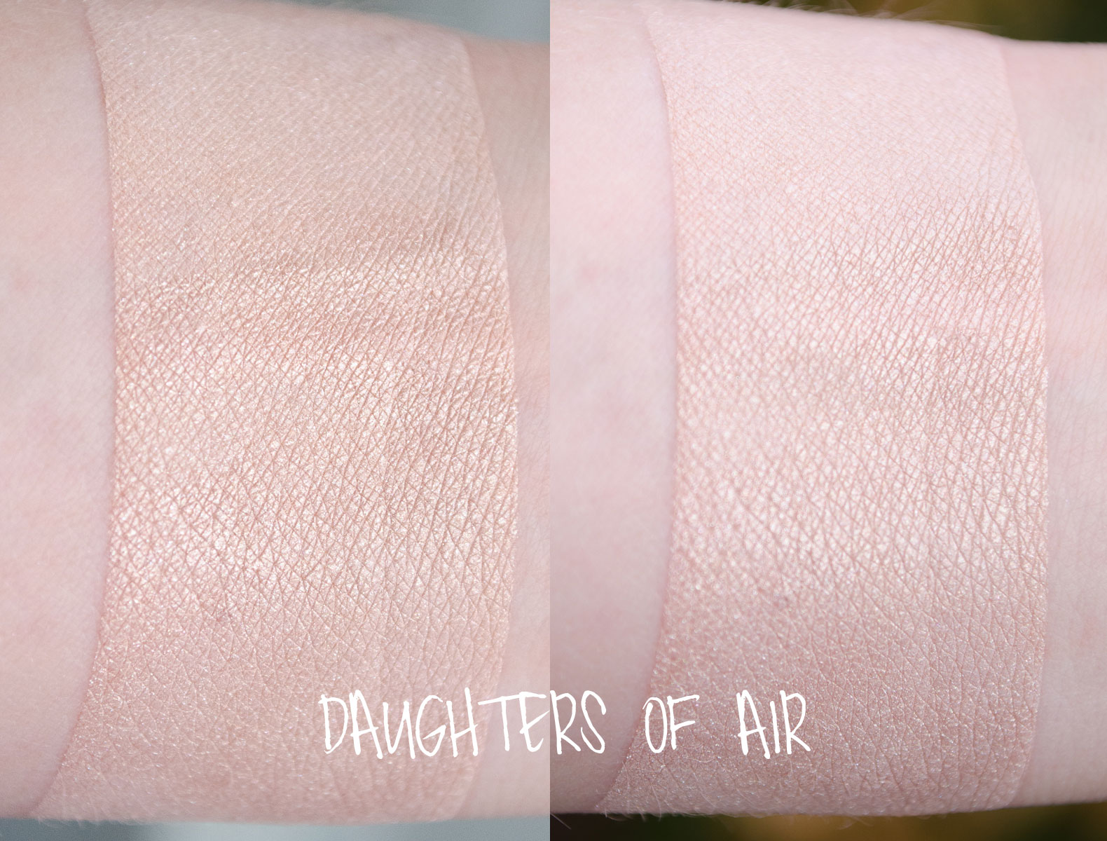 I think both of the lightest colors of the collection are lovely, but I particularly looove Daughters of Air! On my skin, it’s a very pale peachy pink color with just enough shimmer to it. Very delicate, and it served as a great nude lid color the first time I used it (which I unfortunately did not take photos of,  so you’ll have to take my word for it).