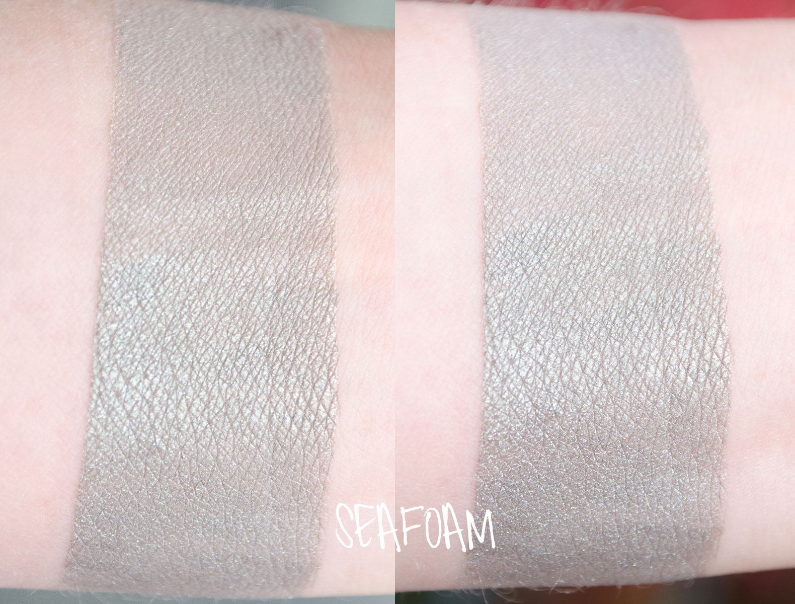 Seafoam is a light blue-green with gray tones. It is fairly sheer over primer alone, but over a glitter adhesive has a lovely amount of shimmer.